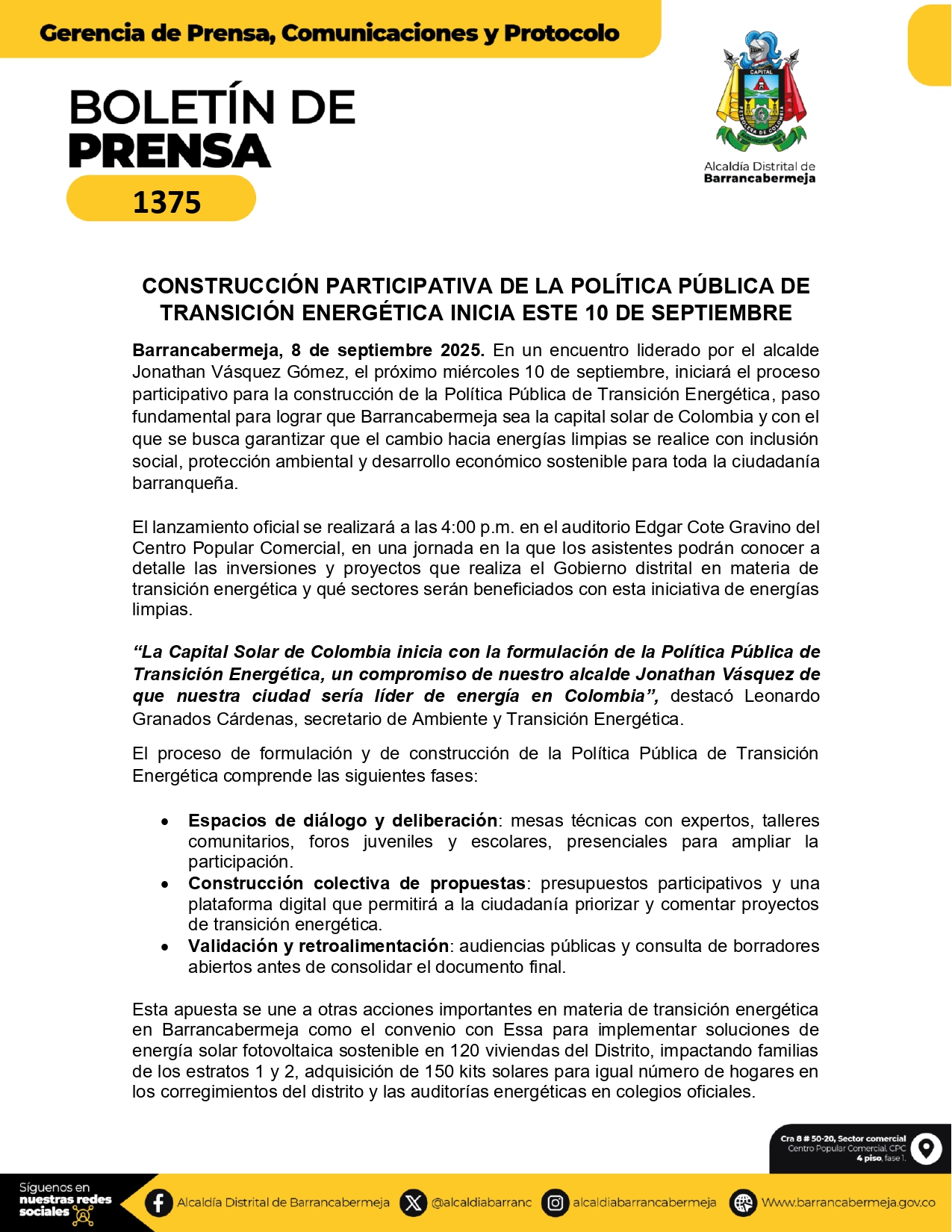 Barrancabermeja, conocida como la capital petrolera de Colombia, da un paso firme hacia el futuro con la puesta en marcha de la construcción participativa de su política pública de transición energética, un proceso que comenzará este 10 de septiembre con la vinculación de la comunidad, instituciones y sectores productivos.